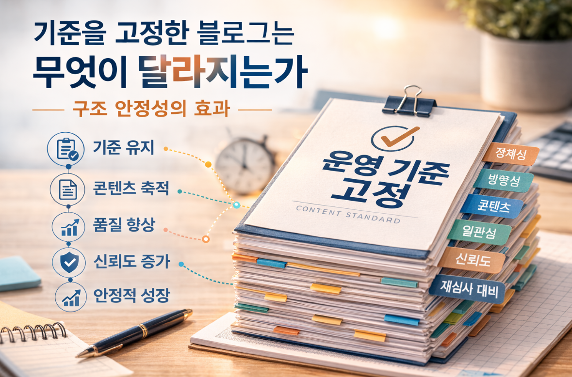 기준을 고정한 블로그는 무엇이 달라지는가— 구조 안정성이 만드는 장기 효과기준이 없으면 흔들림은 반복된다블로그 운영에서 가장 흔한 문제는방향이 자주 바뀌는 것이다.조회수에 따라트렌드에 따라심사 결과에 따라이 변화가 반복되면블로그는 축적이 아니라 소모가 된다.기준을 고정하면흔들림은 줄어든다.이 글은기준이 고정된 블로그가어떤 점에서 달라지는지 정리하는 문서다.1. 주제 변화에 흔들리지 않는다기준이 고정되면주제가 달라져도 방향은 유지된다.왜냐하면해석 방식이 동일하기 때문이다.구조 중심 설명판단 선행 방식단계형 배치이 세 가지가 유지되면주제는 확장되지만정체성은 유지된다.2. 수정이 방향 전환이 되지 않는다기준이 없는 블로그는수정이 곧 방향 전환이 된다.그러나 기준이 고정된 블로그는수정이 보완이 된다.✔ 설명 강..