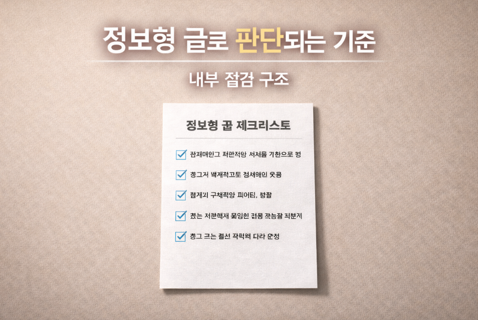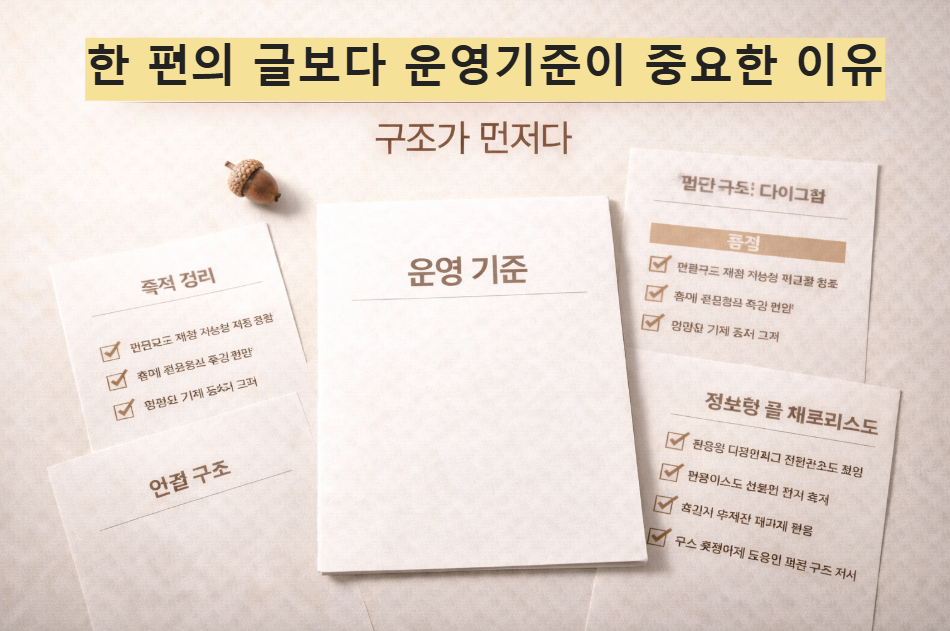 정보 저장소형 블로그의 글 배치 전략— 무엇을 어디에 두는지가 방향을 결정한다배치는 디자인이 아니라 전략이다많은 블로그가글의 내용에는 신경을 쓰지만배치에는 전략을 두지 않는다.그러나 애드센스 심사와플랫폼 신뢰를 동시에 고려하면다음 질문이 중요해진다.이 블로그는처음 들어왔을 때 무엇이 먼저 보이는가?배치는 미적 요소가 아니라운영 의도를 드러내는 구조 신호다.이 글은정보 저장소형 블로그가어떤 기준으로 글을 배치하는지 정리한 문서다.1. 상단에는 ‘기준 문서’를 둔다상단 영역은블로그의 방향을 정의하는 공간이다.여기에 단기 정보나일상 기록이 배치되면정체성은 약해진다.정보 저장소형 블로그는상단에 다음을 배치한다.정체성 선언 글운영 기준 문서구조 설명 글이 배치는“이 블로그는 무엇을 하는 공간인가”를즉시 설명한다...