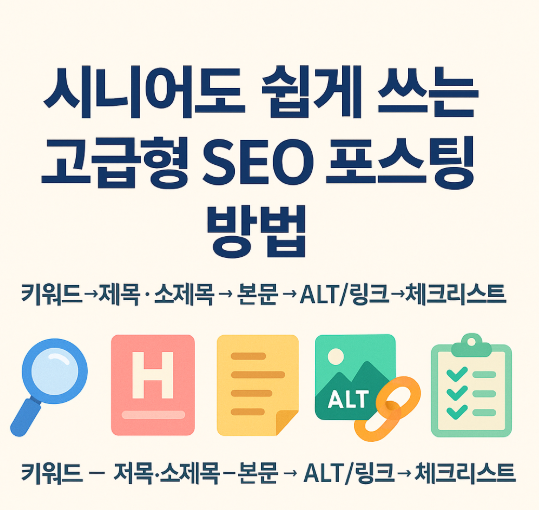 시니어도 쉽게 쓰는 고급형 SEO 포스팅 방법 서론 – “검색 상위와 승인, 두 마리 토끼 잡기”복잡한 도구를 몰라도 됩니다. 키워드 → 제목/소제목 → 본문 배치 → ALT/링크 → 체크리스트만 지키면 검색 노출과 애드센스 정책 모두 안전하게 가져갈 수 있습니다.📑 목차키워드 조사 기본기 (무료·유료 툴 비교)제목·소제목에 키워드 넣는 법본문 내 자연스러운 키워드 배치이미지 ALT 태그 활용법내부링크·외부링크 최적화마무리 – 1시간 완성 SEO 체크리스트1) 키워드 조사 기본기 (무료·유료 툴 비교)무료: 자동완성/연관 검색어로 의도 파악(정보형·비교형·구매형).유료: 난이도(KD), 클릭 잠재력, 시즌성 확인—중간 난이도 + 명확한 의도를 우선.선정 룰: 한 글에 주제 키워드 1개 + 변형 2~3개..