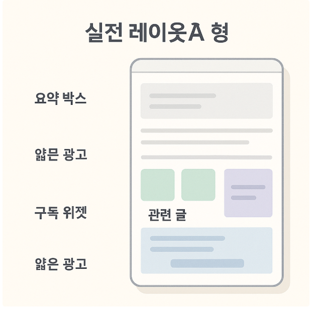 스크롤 중간에는 광고 하나만 단독으로 두기보다 관련 글 2~3개와 함께 묶어 “선택지 섹션”을 만듭니다. 독자가 더 읽을 이유를 제공하면 체류 시간이 늘고, 알고리즘은 품질 신호를 높게 평가합니다.