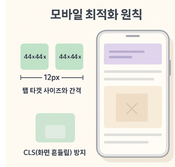 모바일에서 링크·버튼의 최소 터치 영역은 44×44px, 요소 간 간격은 8~12px을 권장합니다. 광고·링크가 서로 맞닿으면 오타치로 이탈이 발생합니다.