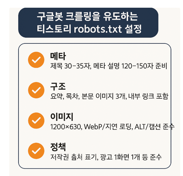 아래는 티스토리 환경에서 안전하게 시작할 수 있는 기본안입니다. 도메인과 피드/검색/태그 등 불필요한 영역을 정리했습니다.