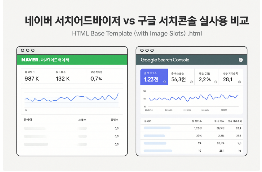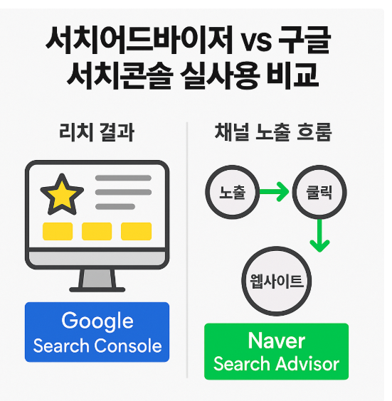 국내 도달을 극대화하려면 서치어드바이저, 기술/글로벌 SERP 튜닝은 서치콘솔이 유리합니다. 두 도구의 지표를 함께 보면서 제목·요약·내부 링크·스키마를 주기적으로 조정하면 안정적인 자연 유입을 확보할 수 있습니다.
