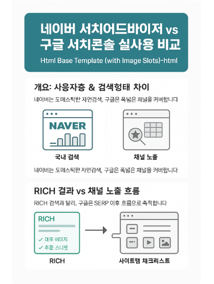 팁: 동일 글에 대해 “네이버용 제목 스니펫”과 “구글용 H2 구조”를 분리 설계하면 성과가 안정적입니다.
