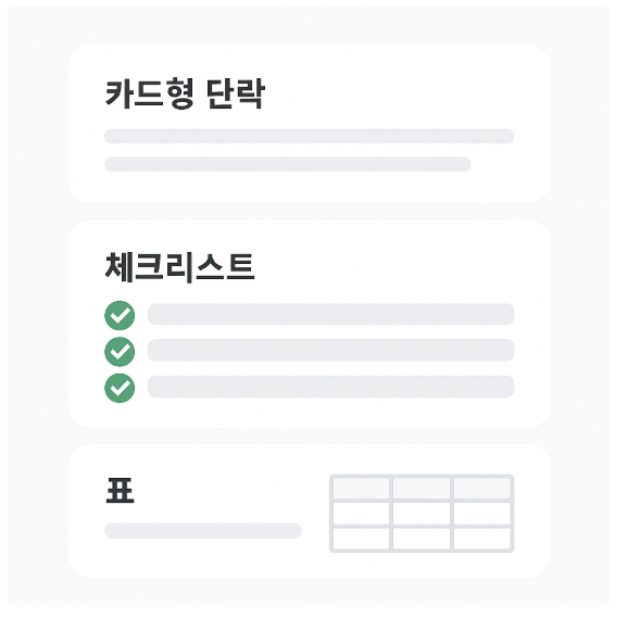 - 카드형 단락: 4~6줄 단락 + 소제목/이모지로 시각적 앵커 제공