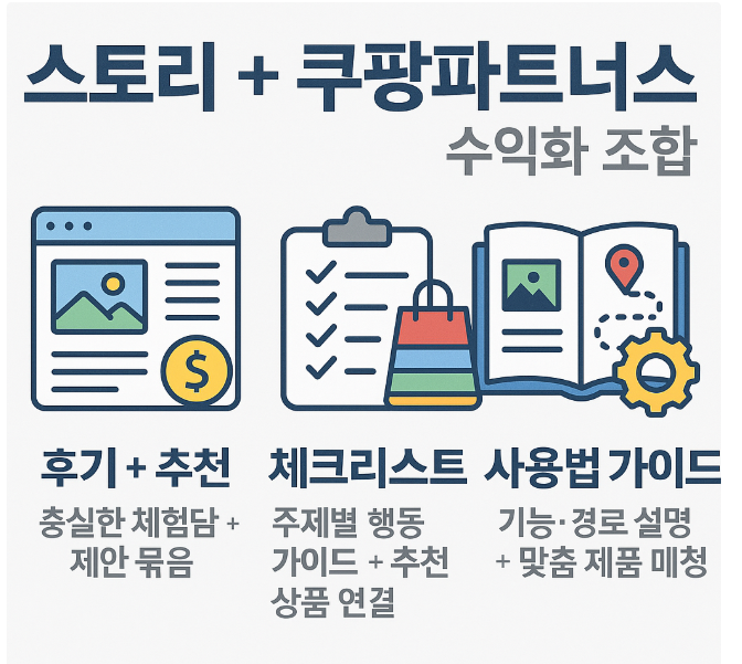 스토리는 관심을 끌고, 쿠팡파트너스는 행동을 연결합니다. 두 요소를 퍼널로 엮어 주제 선정→제품 매칭→배치→고지→트래킹 순서로 시스템화하면, 글 한 편이 단발 수익이 아닌 반복 가능한 전환 자산이 됩니다.