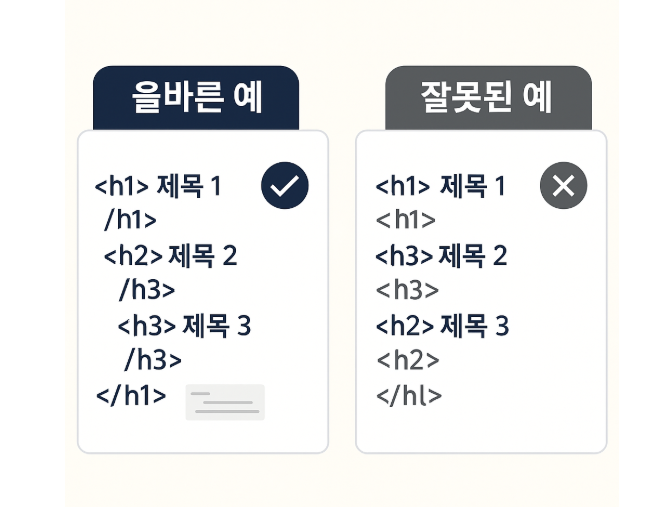 좋은 예 H1>H2>H3, 나쁜예 H2다음에 H4로 점프. 동일레벨 남용 - 계층을 건너뛰면 목차 생성기가 오작동하거나 가독성이 떨어집니다