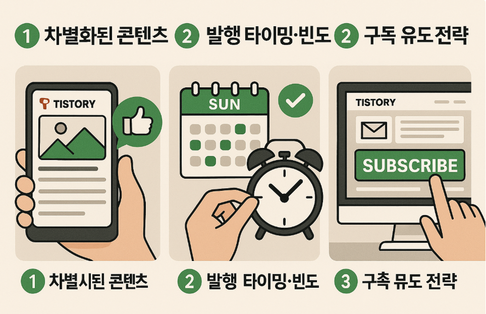 티스토리 자체 구독 기능과 더불어, 구글 폼/메일침프/스티비 등 외부 툴을 연결해 이메일 구독을 병행합니다. 환영 시퀀스(Welcome)를 3편으로 구성하여 신뢰를 빠르게 형성하세요.