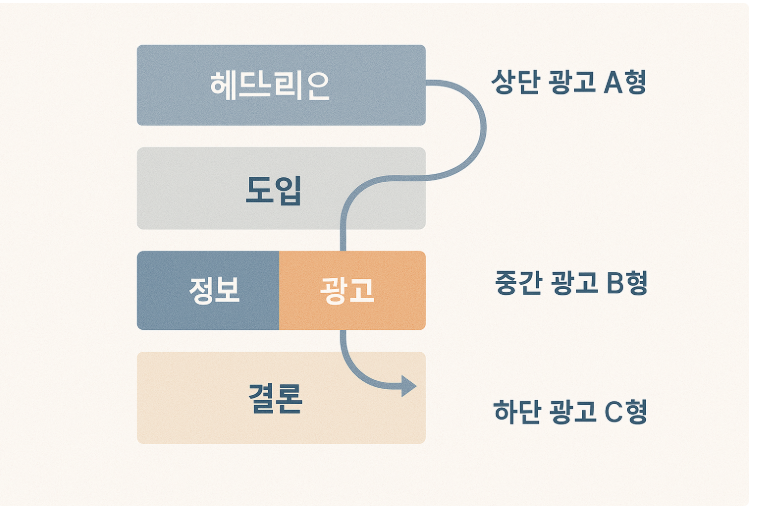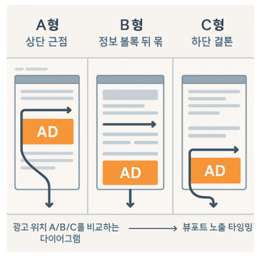 - 시선 리듬: 상단 즉시 노출(A)은 “광고 먼저” 인상으로 초기 이탈 증가.