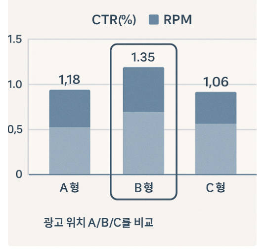 가설: “정보 블록 뒤 얇은 광고(중간 배치)가 상단 근접 배치보다 CTR·RPM에서 우수하다.”