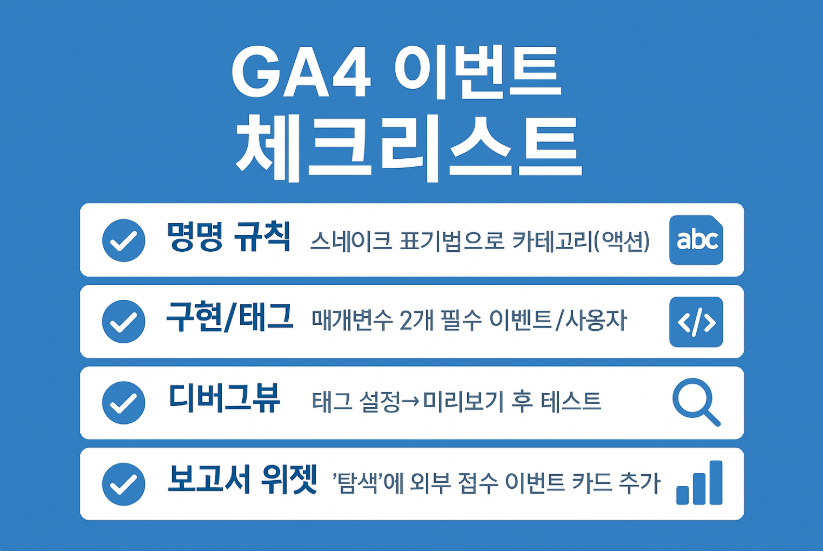 - 디버그뷰: GA4 DebugView에서 이벤트 이름/파라미터가 실시간으로 도착하는지 확인.