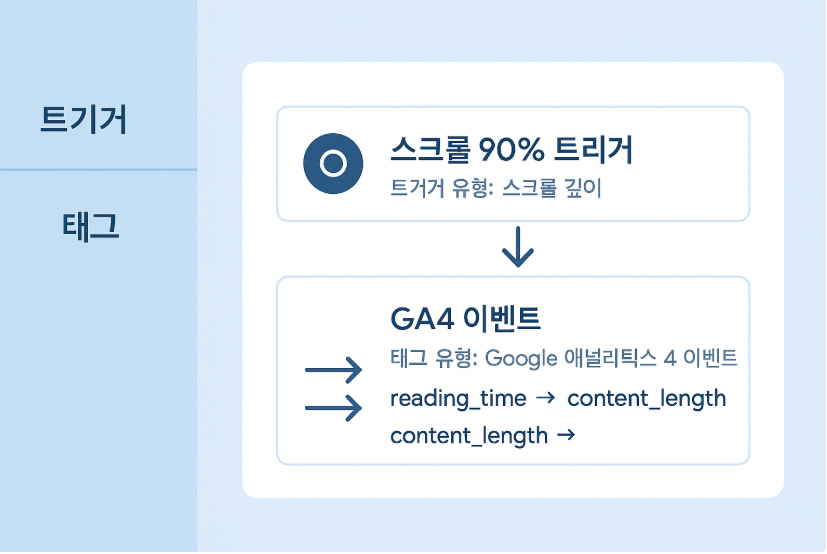 - 트리거: 스크롤 깊이(90%), 링크 클릭(일치 조건: 아웃바운드), 커스텀 이벤트.