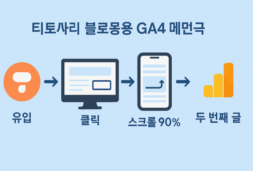 티스토리 블로그의 핵심 목표는 유입 확대와 깊이 있는 탐색입니다. GA4에서는 기본 수집만으로는 부족할 수 있으므로, 블로그 특성에 맞춘 커스텀 이벤트가 필요합니다. 아래 5가지를 권장합니다.