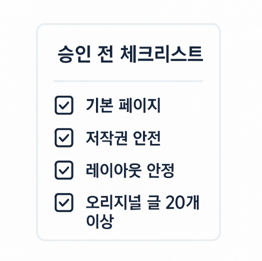 승인 여부는 주제 집중·오리지널리티·정책 준수가 좌우합니다. 위 표준 루틴(점검→신청→대기 중 품질 유지→점진적 배치)을 템플릿으로 고정해 운영 효율과 승인 가능성을 함께 끌어올리세요.
