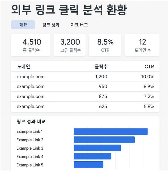 - 개요 카드: 전체 클릭수, 고유 도메인 수, 전환률(있다면).