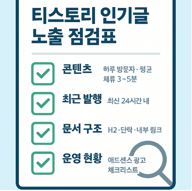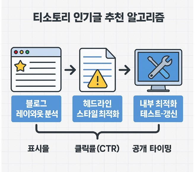 티스토리 인기글 노출은 단순히 트래픽 폭발을 의미하지 않습니다. 이는 곧 블로그 브랜드 신뢰도, 애드센스 수익, 검색 상위 노출로 이어지는 중요한 단계입니다. CTR, 체류시간, 업데이트, 내부 링크, 참여 유도 등 알고리즘의 핵심을 이해하고 전략적으로 대응하면 누구나 인기글에 도전할 수 있습니다.