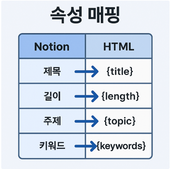 아래 블록을 기본 뼈대로 사용하고, Notion의 속성/본문을 치환합니다.