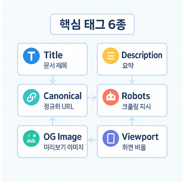Title·Description·Canonical·Robots·OG·Viewport 6종이 기본 세트입니다.