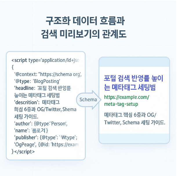 <meta property="og:description" content="메타태그 핵심 6종과 구조화 데이터로 반영률을 높이는 법.">