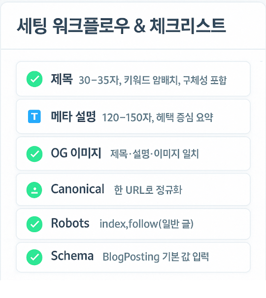 "description": "메타태그 핵심 6종과 OG/Twitter, Schema 세팅 가이드.",