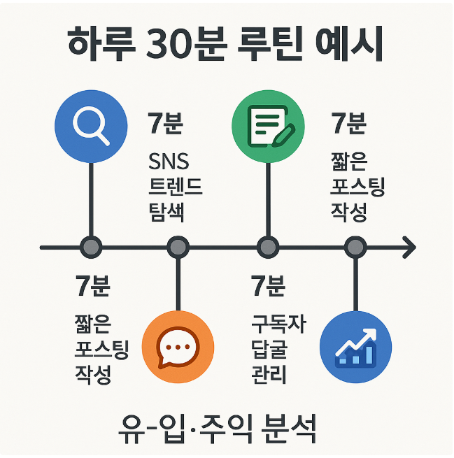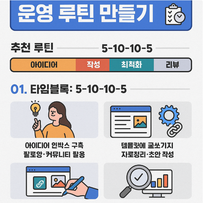 블로그 성장은 ‘의지’가 아니라 루틴에서 나옵니다. 하루 30분만 확보해도, 타임블록으로 나누어 반복하면 주 5회 발행과 지속적인 리라이팅이 가능합니다. 핵심은 결정 피로를 줄이고 매일 같은 순서로 움직이는 것입니다.