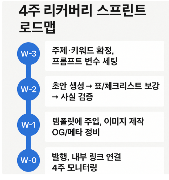 - W-2 콘텐츠: 얕은 글 8~12개 선별 → 표/체크·출처 보강 → 리라이트.
