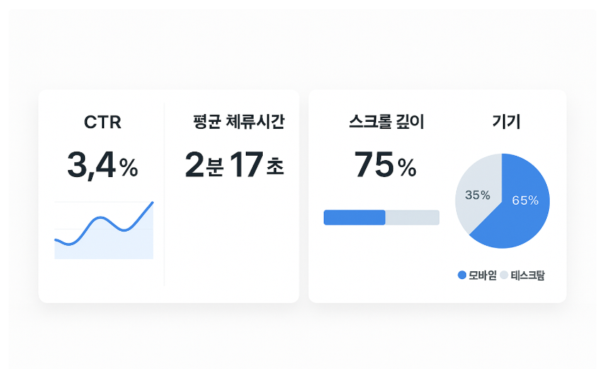 3. 분석: 클릭률, 평균 체류시간, 스크롤 75% 도달률을 함께 보정.
