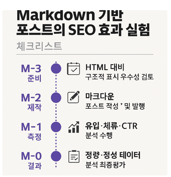 - 대표 썸네일: 1200×630, “Markdown SEO 실험” 12~16자 문구.